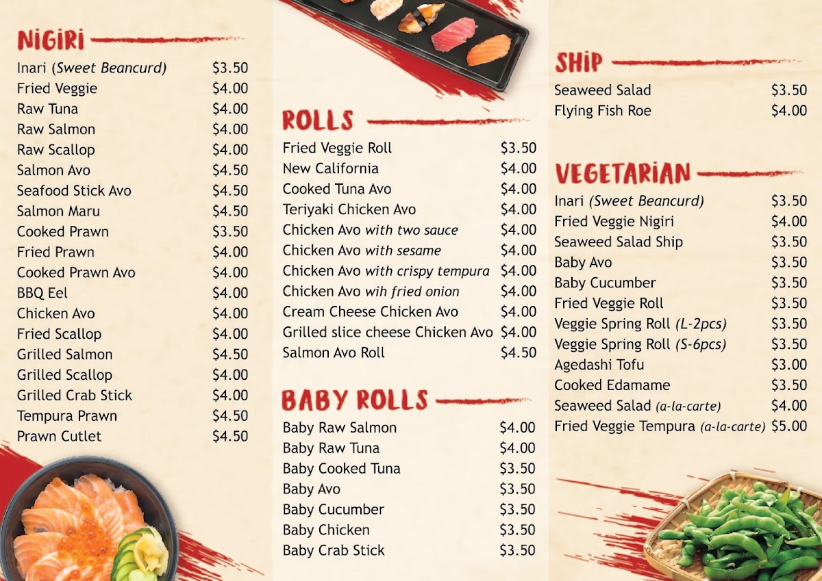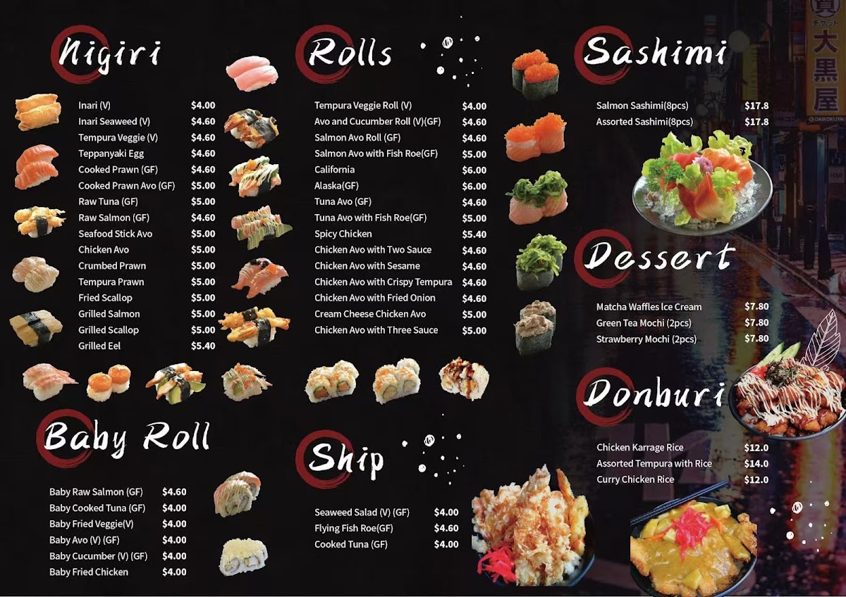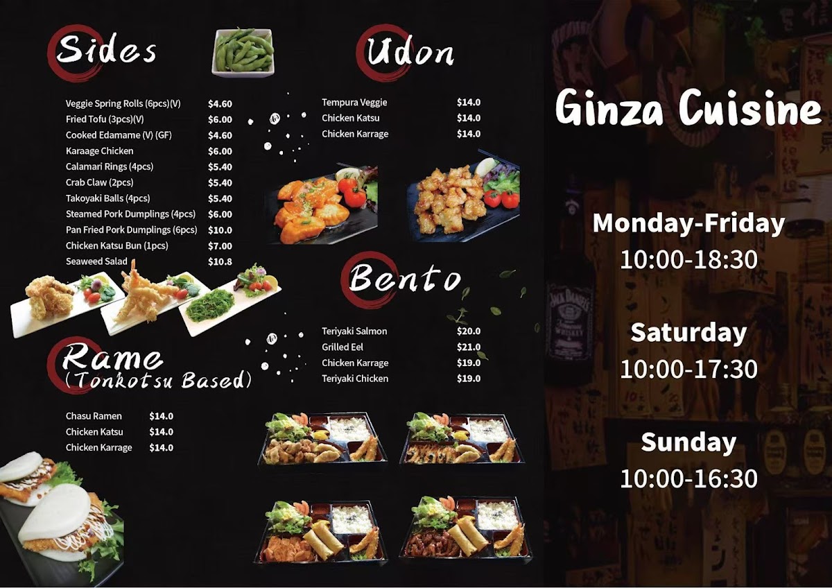 Ginza Cuisine at Hinkler Central offers a diverse and flavorful menu that caters to a variety of tastes, from vegetarians to seafood lovers. For those seeking vegetarian options, dishes like Fried Veggie Tempura and Seaweed Salad (À La Carte) stand out, while the Baby Avo and Fried Veggie Roll provide refreshing alternatives. Udon and ramen dishes such as Crispy Chicken, Teriyaki Chicken, and Tempura Prawn offer a hearty, satisfying meal, while bento lovers can enjoy a variety of choices, including the Tempura Prawn, Calamari Sashimi Bento, and Chicken Katsu. The don section features favorites like Honey Chicken, Sweet & Sour Pork, and Crispy Chicken. For sushi enthusiasts, the Grilled Salmon Nigiri and Prawn Cutlet nigiri are must-tries, as well as the delicious Flying Fish Roe and Raw Salmon. Side dishes such as Pan-Fried Pork Gyoza (6 pieces) and Fried Chicken Wonton (4 pieces) are perfect for sharing or as starters. The rolls section showcases unique creations like the Salmon Avo Roll and the Chicken Avo with Fried Onion, while the dessert menu offers a sweet conclusion with options like Mango Mocha and Vanilla Mochi. Whether you're in the mood for something light or a fulfilling main, Ginza Cuisine provides a range of delicious choices that will satisfy every palate.
